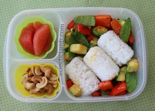 I made this meal for husband to heat up in the microwave on a night he came home late for dinner. I put the grapefruit and cashews in silicone cups so he could easily remove them before heating up the rest of this meal.