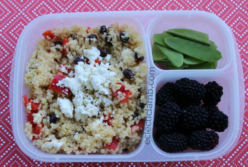 Left Side: Quinoa with black beans, red bell pepper, feta cheese, chili powder, salt, and lots of lime juice