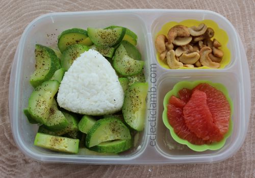 This is another meal I made for my husband to heat up when he came home. The cashews and grapefruit are in silicone cups so he could easily remove them before heating the rest in the microwave.