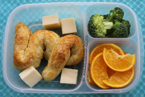 Left Side: Homemade soft pretzel with Cheddar cheese