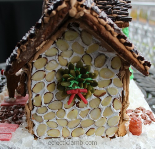 My nephew and I went to the seasonal Gingerbread display at the George Eastman Museum. That is where I got the idea for the licorice roof and pumpkin seed wreath. I used green frosting from my Christmas tree instead of white frosting and I like the effect. The bow is pull apart candy.