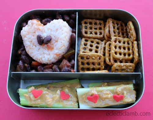 Bottom: Celery with natural peanut butter and heart sprinkles