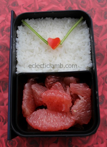 I used a Precious Moments cookie cutter to make the sandwich in this lunch. The heart shaped skewer was given to me by my Mom. She got it on a recent flight.