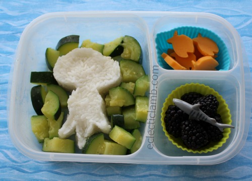 Left Side: Jellyfish – press cooked hot Nishiki rice (or short grained sticky rice) into a cookie cutter with plastic wrap then carefully remove rice from cookie cutter, cooked zucchini with salt, pepper and a little butter