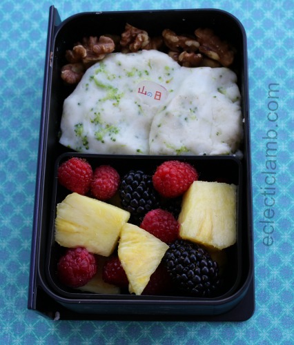 Contents: Broccoli and cheese mashed potatoes, toasted walnuts, homemade bento pick (used shrink plastic and my oven to make them) my neighbor made them with me, raspberries, blackberries, pineapple