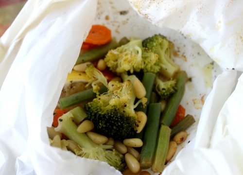 Veggie Packets – broccoli, carrot, green beans, mushrooms, lemon slices, and pine nuts (I added them they were not in original recipe) cooked in parchment. I LOVED this recipe. It had a robust lemon flavor! My Dad also loved this one. My Mom was not as much in love – the lemon was a little too much for her.