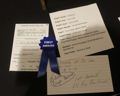 The overall theme of the Flower Show was Holidays at the Inn. I entered under Artistic Crafts “Creative Gifts, Gifts for the Birds”. A feast of bird food suitable for hanging from a tree. Not a conventional bird feeder. No greater than 8 inches in any dimension. To be hung from a rod near eye level.