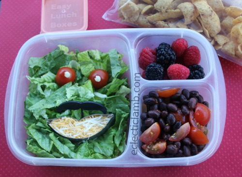 Left Side: Eyes – cherry tomatoes with Cheddar cheese (attach cheese with small pieces of spaghetti – used a toothpick to make holes), mustache pick, Mouth – cookie cutter filled with Mexican cheese blend, lettuce