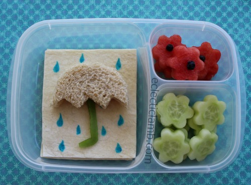 Left Side: Umbrella – wheat bread, peanut butter, snow pea, Sky – tortilla, peanut butter, food coloring marker details