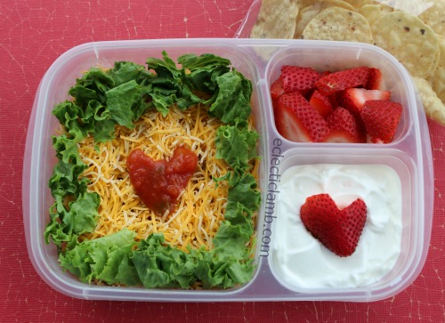 Left Side: Heart Taco Salad – lettuce, taco cheese blend, salsa heart, black beans (under lettuce)