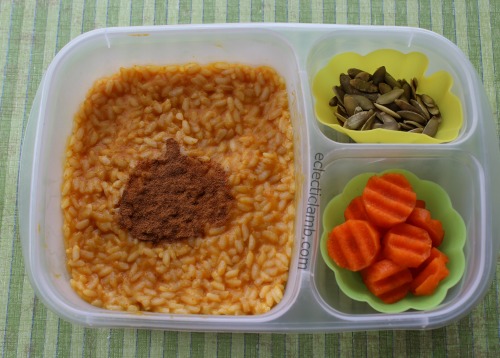 Left Side: Pumpkin rice – cook rice in vegetable broth, add some pumpkin puree, pumpkin shape cinnamon (stencil)