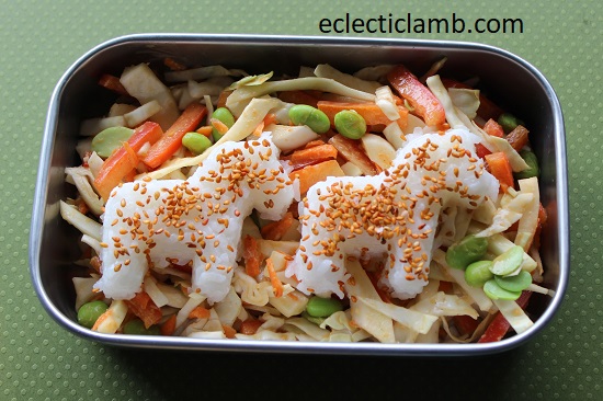 Contents: Horses – Nishiki rice shaped with a horse shaped rice mold, Sriracha flavored sesame seeds, Asian Cabbage Salad (I did not use cilantro)