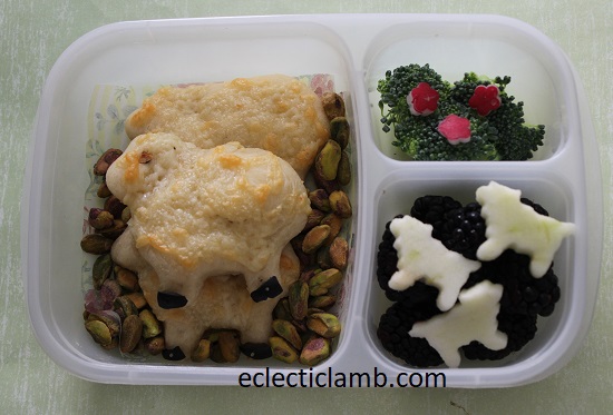 Left Side: Sheep – homemade pizza dough, cut with a cookie cutter, sharp cheddar cheese, Eye – pistachio, Feet – black olive attached with piece of spaghetti, pistachios