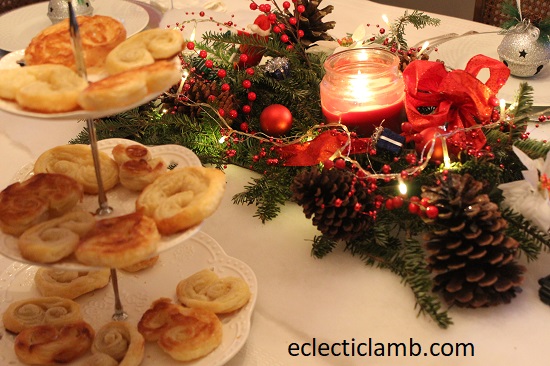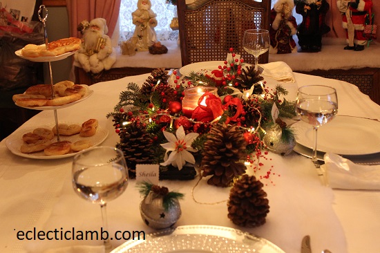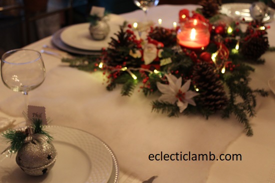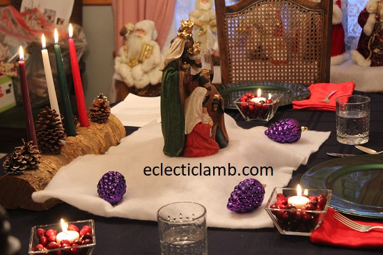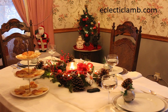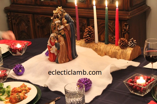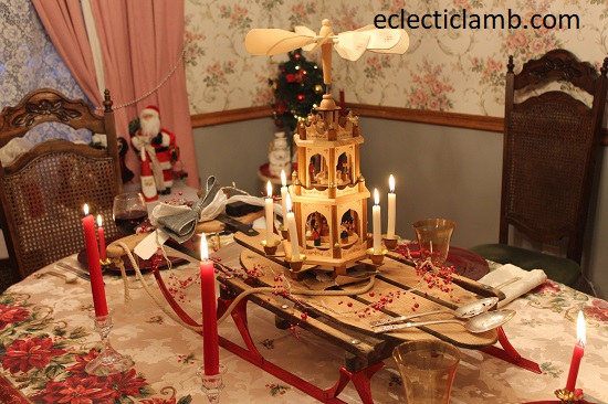 I was fortunate to spend 5 days at my parents house for Christmas this year. When my Mom and I planned the meals, she wanted to have themed nights celebrating different countries. My Mom planned the tablescapes for each of the meals. My parents researched traditional Christmas celebrations in each country. It inspired the table decorations. Also they prepared fun facts about the holiday celebrations. The table decorations were special and added to the atmosphere. The German wooden winter pyramid was a huge hit. We delighted in watching the scene spin around from the heat of the candles.