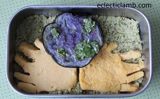 Contents: Earth – roasted eggplant brushed with a little olive oil and Butterfly Pea Flower Powder for the water and some basil-lemon-walnut to represent land. Hands – polenta cooked in vegetable broth, cut with cookie cutter, mashed garlic broccoli (to make it vegan for my friend, I did not use cheese)