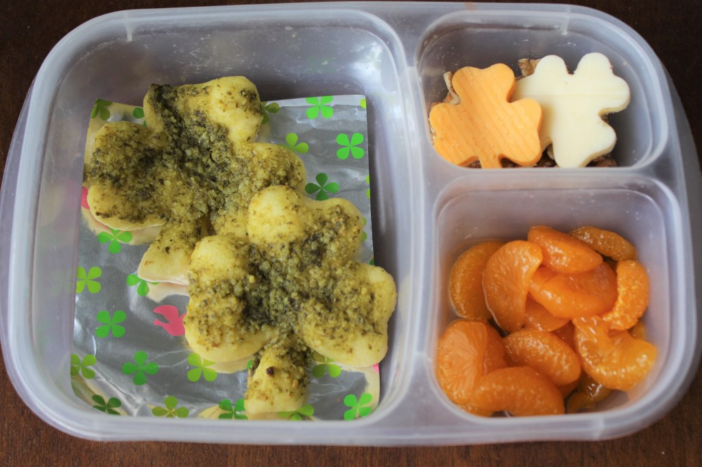 Left Side: Shamrocks – pesto pizza cut with a cookie cutter