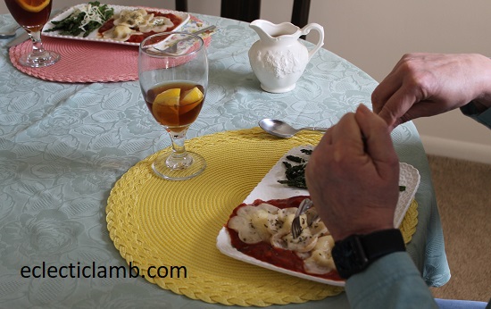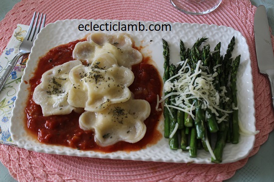 My critique of the meal: We all loved it. I don’t think that I would have done anything different. But if I really need to be critical, maybe next time I would plan a decorative center on top of the flower ravioli. I thought about it ahead of time but did not plan anything. Last minute as I was plating, I sprinkled some dried basil on top of the ravioli.