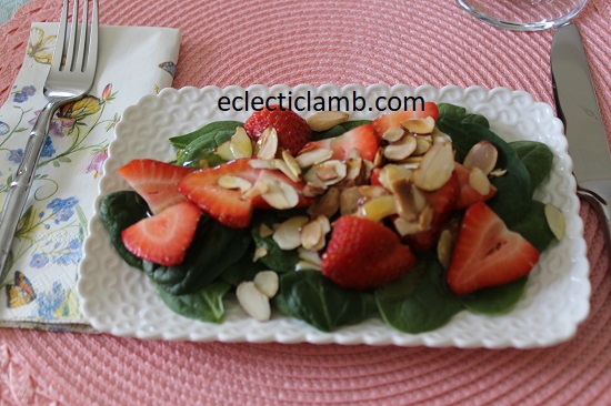 Spinach Strawberry Salad – Spinach leaves, sliced strawberries, toasted sliced almonds