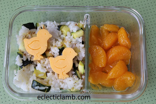 Left Side: Chicks – orange cheddar cut and imprinted with a cookie cutter, rice with roasted zucchini