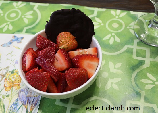 Strawberries with Dark Chocolate – I melted Endangered Species Chocolate, Strong + Velvety Dark Chocolate 88% Cocoa and made round disks.