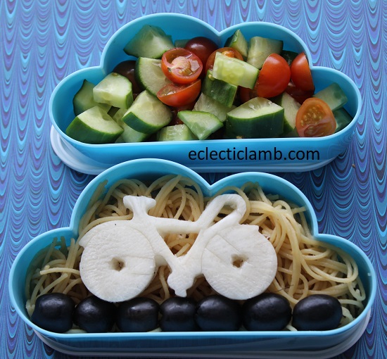 Large Box: Bicycle – black radish cut with a cookie cutter, black olives, peanut noodles