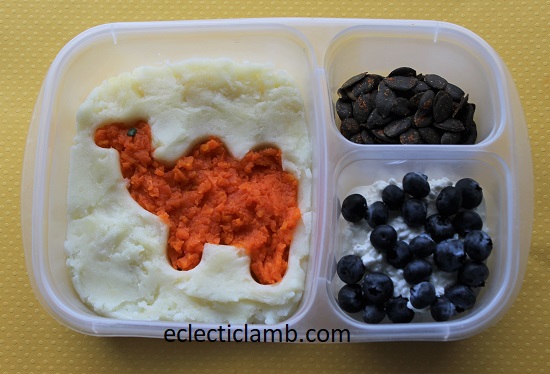Left Side: Camel – mashed carrots (shape made with a cookie cutter), Eye – spinach cut with mini cutter, garlic cheese mashed potatoes
