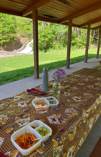 Awhile ago, I came up with the idea that I wanted to have a meal by a waterfall. My friend Deborah was happy to join me in this adventure. We met at the Holley Canal Falls. I made this vegan meal for Deborah. I made a similar but themeless meal for myself with nuts instead of the cookie nest. I think it was my first time to make a carrot salad. I loved the flavors, especially the curry and maple syrup! Deborah brought along a tablecloth and flowers. It was the first time for both of us to visit this waterfall. We had a wonderful time and enjoyed it so much that we stayed there for 3 hours! Now we are planning our next adventure.