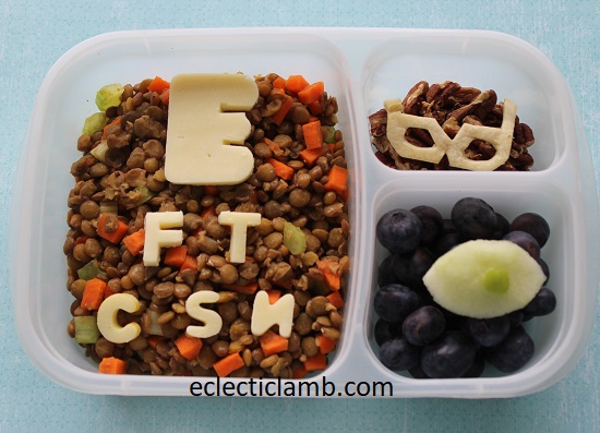 Left Side: Big E and other letters – cheddar cheese cut with cookie cutters, lentil salad (I loosely followed this but did not use the onion, bell pepper, bay leaf and parsley. I cooked the lentils in vegetable broth.) Asiago cheese is under the lentils.