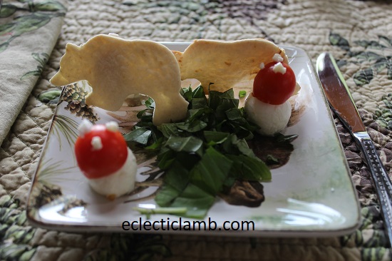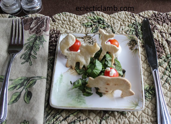 Woodland 3D Appetizer Plate – Fresh mozzarella balls and tomatoes with basil, tortilla chip bear, fox, and deer – cut tortilla chips with a cookie cutter, lightly brush with olive oil, put on cookie sheet and bake in a 350 degree oven for about 10 minutes or until lightly browned and crisp