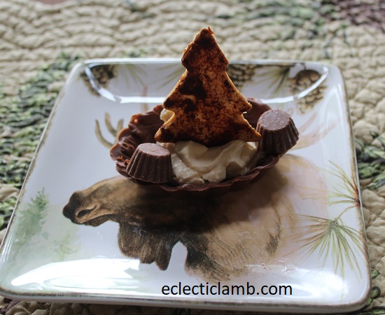 Forest in a Cup – Chocolate cups, Greek yogurt with peanut butter powder, cinnamon tortilla chip trees – cut tortilla chips with a cookie cutter, lightly brush with olive oil, sprinkle with cinnamon, put on cookie sheet and bake in a 350 degree oven for about 10 minutes or until lightly browned and crisp, miniature peanut butter cups