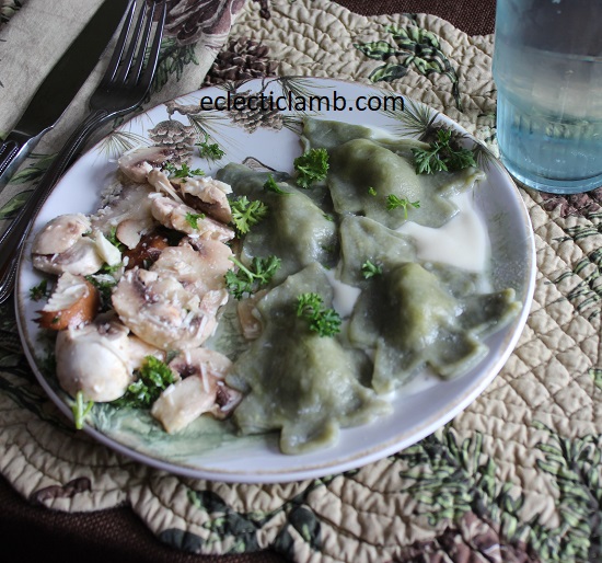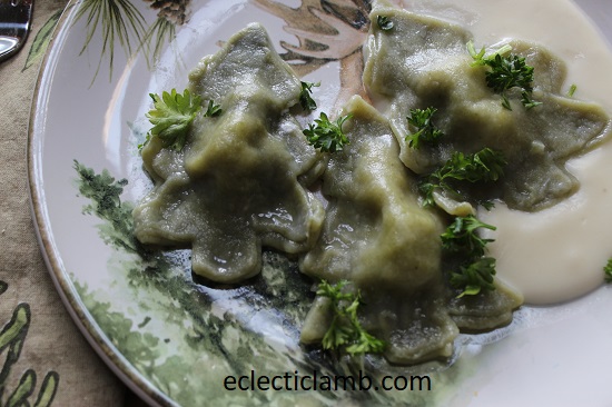 Tree Ravioli – I added spinach powder to my favorite pasta dough, the filling was ricotta, parmesan, garlic powder, salt and pepper. I cut the tree shapes with a cookie cutter. Since I did not want it to look like Christmas trees, the sauce is a cheddar cheese sauce. Garnish with fresh parsley.