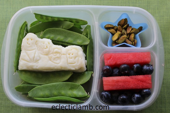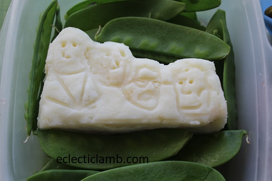 Left Side: Mount Rushmore – Cheddar and garlic mashed potatoes cut and imprinted with a cookie cutter, snow peas