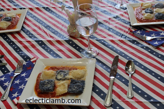 Red, White, and Blue Ravioli – I added butterfly pea flower powder to 1/2 of my favorite pasta dough, the filling was ricotta, parmesan, garlic powder, salt and pepper.