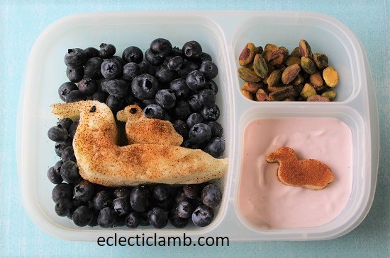 Bottom Right: Loon – apple cut with a cookie cutter, sprinkled with cinnamon, mixed berry Greek yogurt.