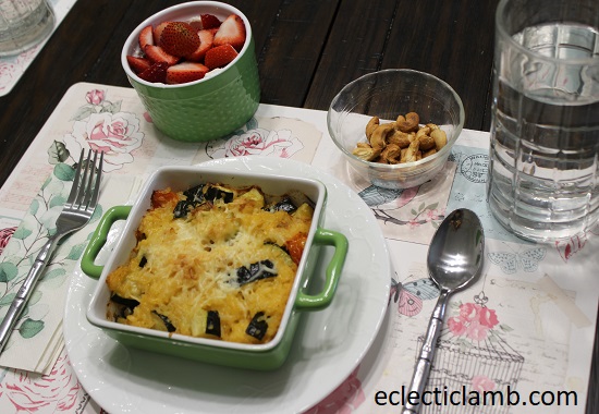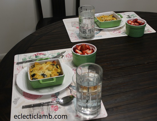 My critique of the meal: We both enjoyed this meal. This is an easy meal and it has a lot of different flavor possibilities. I don’t use these individual dishes very often but I should. They are very attractive and fun to use. The only problem was that I should have served it after cooling down awhile. It was very hot in temperature!