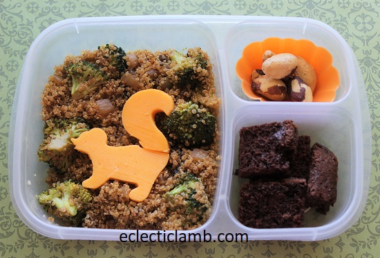 Left Side: Skunk – Cheddar cheese cut with a cookie cutter, Italian Broccoli and Quinoa Pilaf