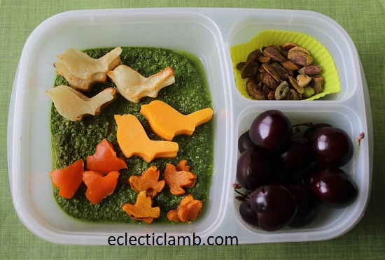 Left Side: Birds – Roasted white and sweet potatoes, orange cheddar cheese, orange bell pepper all cut with cookie cutters, Spinach Walnut Pesto (I also added basil)