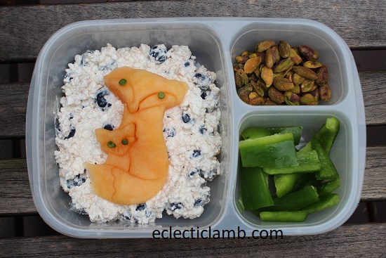 Left Side: Fox – cantaloupe cut with a cookie cutter, Eyes – spinach cut with a straw, cottage cheese with blueberries