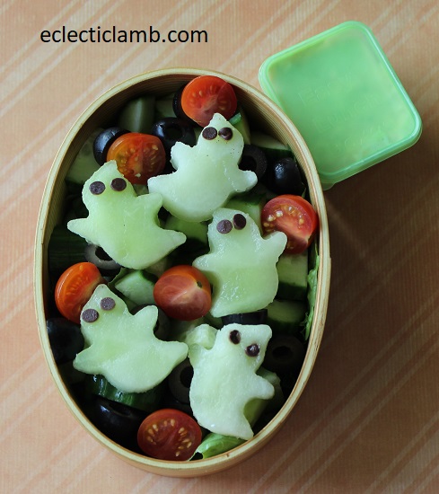 Contents: Ghosts – Honeydew melon cut with a cookie cutter, Eyes – Mini chocolate chips, Romaine lettuce, chopped cucumber, tomato, black olives