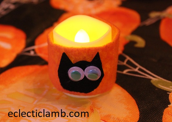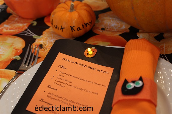 - Cat Napkin Rings – We used stiff felt strips (stapled around cloth napkins), black felt cat heads with multi-color googly eyes glued onto the felt