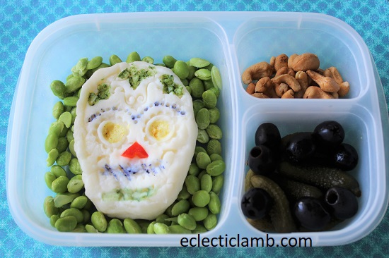 Left Side: Sugar Skull – Cheddar mashed potatoes shaped with a cookie cutter, Green – maccha powder, Purple – butterfly pea powder, Yellow – turmeric, red nose – red bell pepper, soybeans