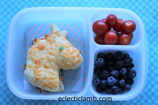 Left Side: Unicorn – homemade cheddar pizzas, Eye – spinach leaf cut with a straw
