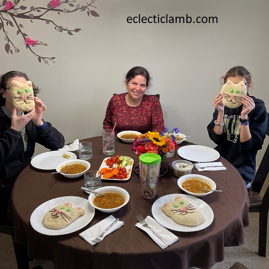 I made a cat themed meal for my friend Renae and her family. Even the lentil soup had cats in it! Her oldest daughter Natalie helped me style the meal.
