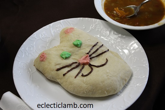 My critique of the meal: I think that everything was enjoyed by all. The cat carrots in the soup were a delight to eat and the bread and cheesecakes were adorable and delicious!