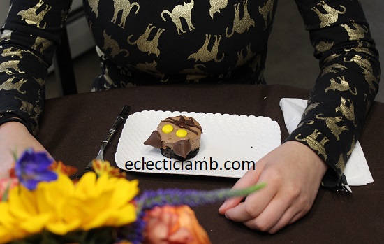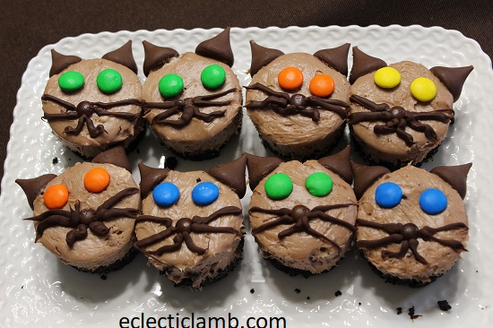 Individual Cat Cheesecakes – details with Hershey kisses, M&M’s large and mini, melted chocolate put in a zip-lock bag with corner cut off