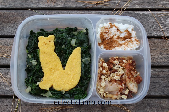 Left Side: Fox – Polenta cut with a cookie cutter, face – cinnamon (drew with a toothpick), sautéed spinach with onions