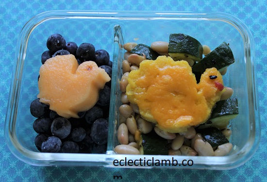 Right Side: Turkey – Polenta cut with a cookie cutter, Body – Broiled Cheddar cheese, Eye – Dried blueberry, Wattle – Tomato, white beans and zucchini