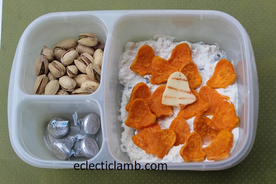 Right Side: Bell- Cheddar cut with a cookie cutter, cinnamon stripe, Bells – Sweet Potatoes cut with a cookie cutter and roasted. Blue Cheese Sauce.