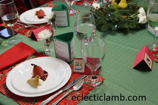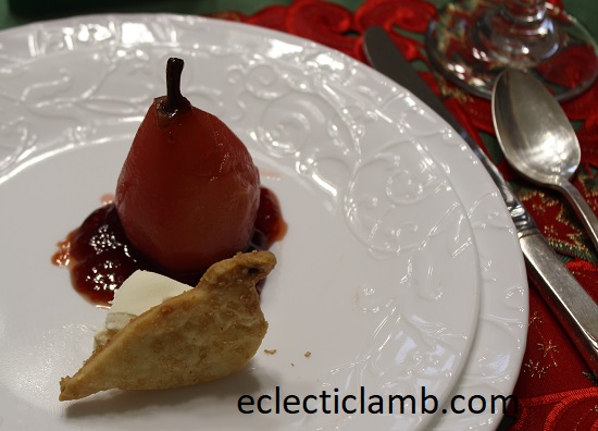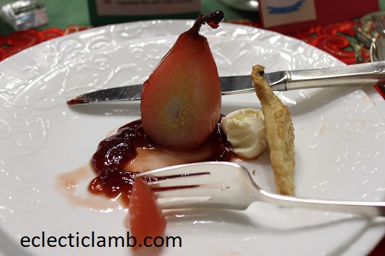 Mini Poached Pear with Partridge Crisp – I made my own pie crust for the partridges. Their eyes are mini chocolate sprinkles. I served them with Mascarpone instead of whipped cream. We poached the pears a day ahead and stored overnight in the refrigerator in the liquid. These had a wonderful flavor. I reduced the sauce a few hours before serving. I reduced it too much since I was concerned about it being too liquidly.