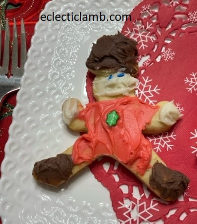 Lords Sugar Cookies – I made my own cream cheese frosting (cream cheese, powdered sugar, vanilla, little heavy cream) with some cocoa powder added for the hats and boots. Eyes – blue sprinkles. I made the cutouts with ninja (did cookie surgery for the second arm) and snowman hat cookie cutters and put them in my freezer a week ahead. On the day of the meal, I frosted them.